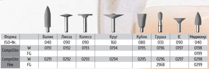 Для первоклассного финирования микро- и гибридных композитов без повреждения эмели применяются инструменты CompoSite.Они также идеально подходят для безопасного удаления остатков цемента, оставшегося после ортодонтических аппаратов (брекетов).Полиры CompoSite Fine (белая маркировка) предназначены для получения сохраняющегося длительное время блеска композитных реставраций.Гибкими и принимающими форму поверхностей инструментами в форме кубков (Kelche) и дисков (Scheiben) возможна надежная полировка субгингивальных и межзубных поверхностей.Инструменты ф форме груши (Birne) и миниконус (MidiSpitze) выпускаются для углового (W) наконечника и для турбины (FG), все другие формы - только для углового наконечника (W).