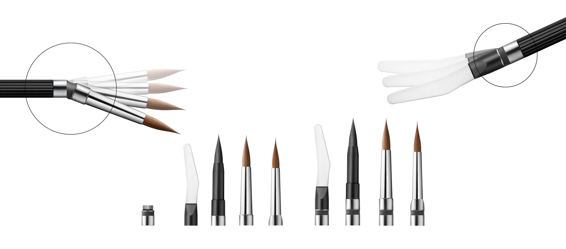 Smile Line представляет FlexMount, гибкий каучуковый коннектор для ручек и модульных инструментов. Эта новая концепция специально адаптирована для инструмента Smile Line, особенно для циркониевого шпателя и кисточек для керамики.