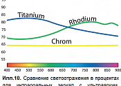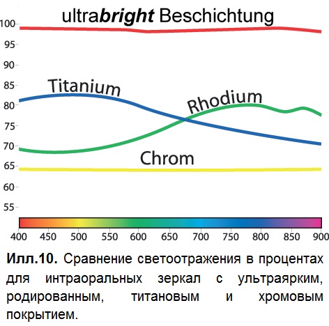 Различия существуют и в качестве зеркального покрытия. Еще несколько лет назад родированные зеркала были стандартом с точки зрения отражающих качеств, а сегодня есть зеркала с hr/высокорефлектирующим или ультраярким покрытием. В отличие от родированных или титановых зеркал, которые отражают примерно 75% видимого света, новейшие покрытия обеспечивают почти 100%ное отражение всего видимого спектра. Результатом этого впервые является точная передача цветов, в то время как родированные и титановые зеркала постоянно дают легкое смещение в серый цвет. Металлические зеркала с учетом их отражающих свойств примерно на 65% и более не соответствуют новейшему уровню техники (илл.10).