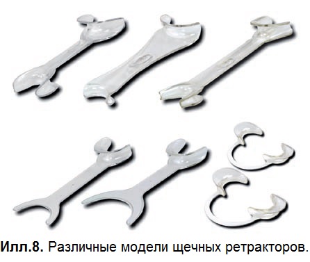 Различаются ретракторы, которые фиксируются сами и теми, которые необходимо держать(илл. 8). Если при съемках во фронтальной зоне самофиксирующиеся ретракторы могут заменить руку ассистента, при съемке боковых зон фотографу как правило необходима помощь ассистентки или пациента. Если камера не слишком тяжелая, при некоторой тренировки можно фотографировать без помощи, регулируя свободной рукой ретрактор. В зависимости от цели применения существуют ретракторы для снимков во фронтальной, боковой зоне и зоне окклюзии. Щечные ретракторы для снимков фронтальной зоны имеют форму большой дуги, чтобы гарантировать максимальное освещение зубной дуги, ретракторы для съемки боковых зон имеет более заостренную форму и позволяют делать снимки моляров без неприятного напряжения в полости рта пациента. Очень полезны также комбинации, когда один конец предназначен для съемки боковых зон, другой конец поддерживает губу при съемках окклюзии.