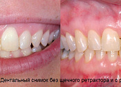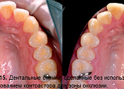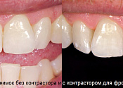 Контрастор для зоны окклюзии выполняет две функции. Наряду с функцией контрастора он используется также как щечный ретрактор или как опора для губ и облегчает обзор окклюзионной зоны. В зависимости от диаметра зубной дуги существуют контрасторы различного размера. Если в работе используется и зеркало, существует две возможности: или пациента просят подержать контрастор, а фотограф в это время вручную вводит зеркало, или зеркало крепится непосредственно на камере, а другая рука освобождается для контрастора. При работе со всеми контрасторами необходимо принимать во внимание, что они расположены не прямо или не параллельно к плоскости снимка, поскольку иначе свет от системы освещения будет рефлектировать непосредственно в камеру. В результате как правило образуется серый малоконтрастный фон. Глубокий черный цвет фона лучше всего достигается, если держать контрастор наискосок за зубным рядом, свет должен как бы отражаться вверх.