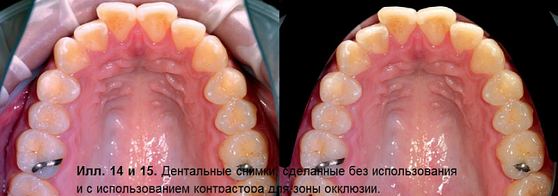 Илл. 14 и 15. Дентальные снимки, сделанные без использования и с использованием контрастора для зоны окклюзии.