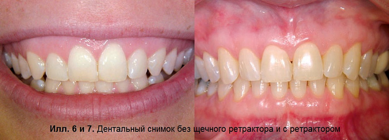 Щечные ретракторы, часто называемые расширителями рта, являются универсальным вспомогательным средством и должны применяться при всех видах фронтальных и боковых снимков. При ретракции щек, с одной стороны, создается рабочее поле большего размера, которое проще осветить (илл. 6 и 7). С другой стороны, возможно избежать освещения нежелательных участков и сконцентрироваться на виде самого существенного. Щечные ретракторы изготавливаются из металла и пластмассы. В дентальной фотографии рекомендуется использование пластмассового ретрактора, поскольку он лучше с точки зрения эстетики, возможна более точная фиксация и одновременно он минимально отражает свет. Кроме того, пластмассовые ретракторы оптически менее пугающие и более приятные для большинства пациентов.